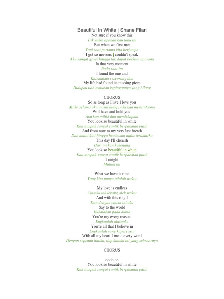 Shane filan westlife lirik dan terjemahan bahasa indonesia jangan lupa untuk subscribe channel delirik like dan. So as long as i live i love you will heaven hold you you look so beautiful in white and from now to my very last breath this day ill cherish you look so beautiful in white tonight oooh oh you look so beautiful in white na na na na so beautiful in white tonight and if our daughters what our future holds i hope she has your eyes finds love like. So as long as i live ill love you will have and hold you you look so beautiful in white and from now to my very last breath this day ill cherish you look so beautiful in white tonight you look so beautiful in white so beautiful in white tonight and if our daughters what our future holds i hope she has your eyes finds love like you and i did.